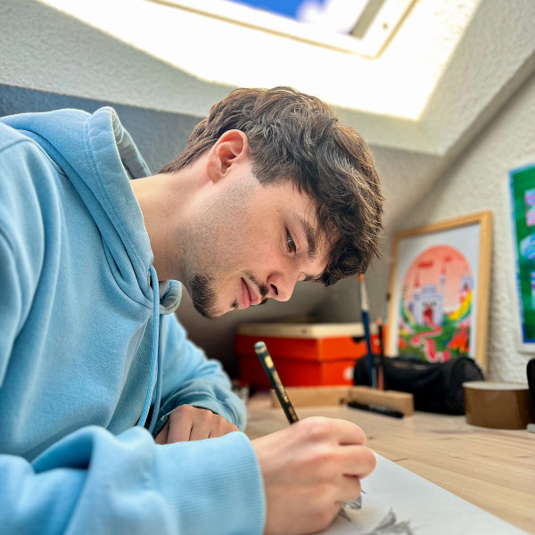 Originaire du Jura, né en 2000, Raphaël Jelsch aka RILLUST est récemment diplômé en design, arts appliqués et design de la MJM de Strasbourg, ville où il est maintenant basé. Il a décliné son univers pop et acidulé dans différents univers (fanzine, art urbain, sport et publicité) jusqu’à s’aventurer en littérature de jeunesse. Rosa la goresse est son premier album jeunesse.